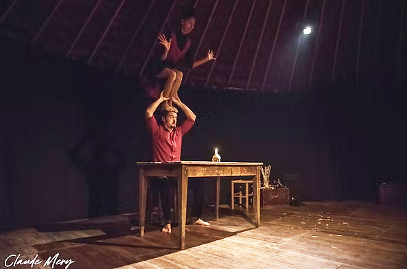Ce spectacle, aussi unique que fragile, fait la part belle au hasard du moment, comme une douce improvisation. Les techniques de Cirque présentées telle que la manipulation de bouteille de vin, les portés dansés, le lancé d’aiguilles à tricoter sur cible mouvante renforcent la narration et l’empathie que le public a pour ce duo.